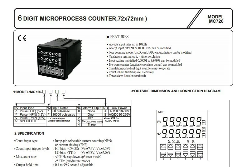 Taiwan Axe Mc726 6 Digit Microprocess Counter 72x72mm In Current